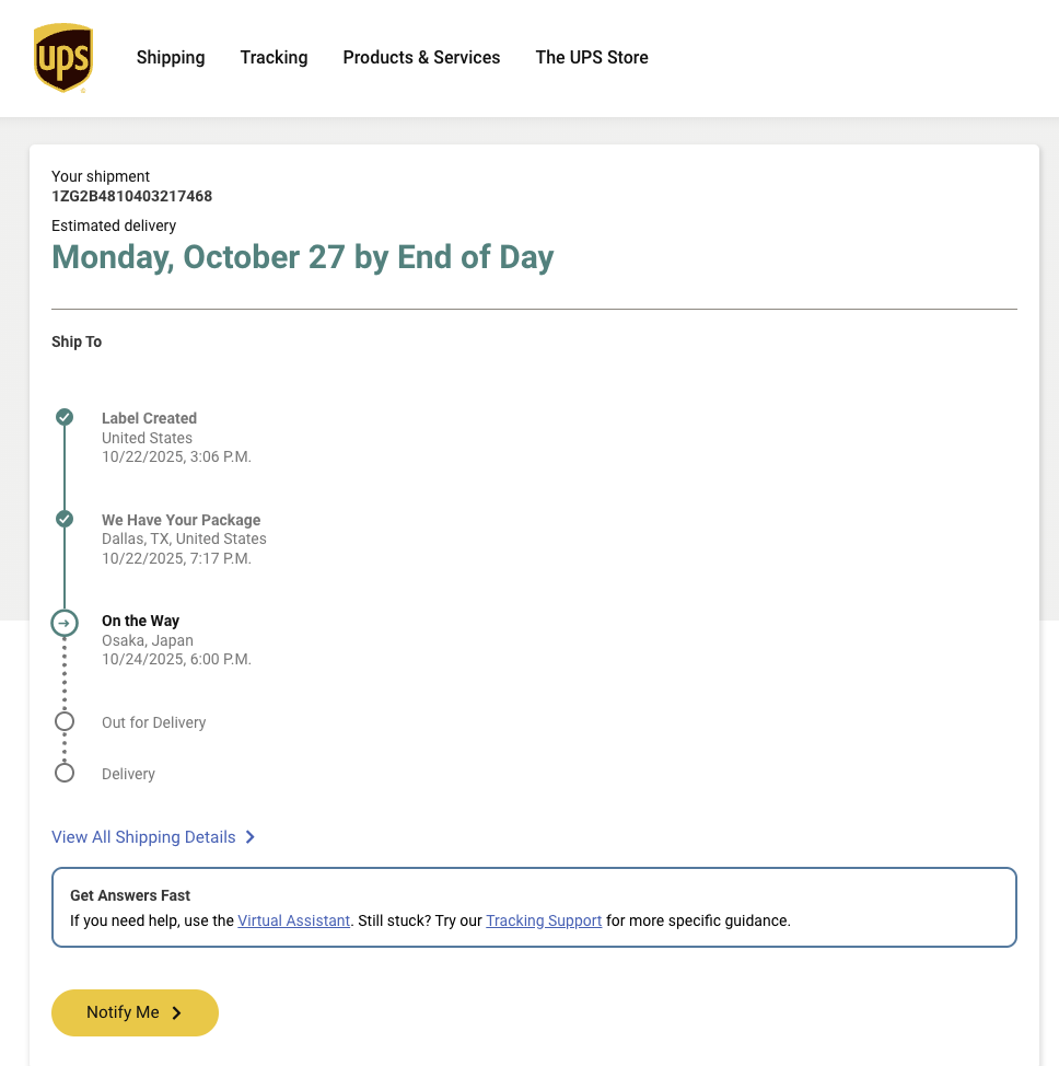 - 荷物は10月22日にテキサス州ダラスで集荷され、