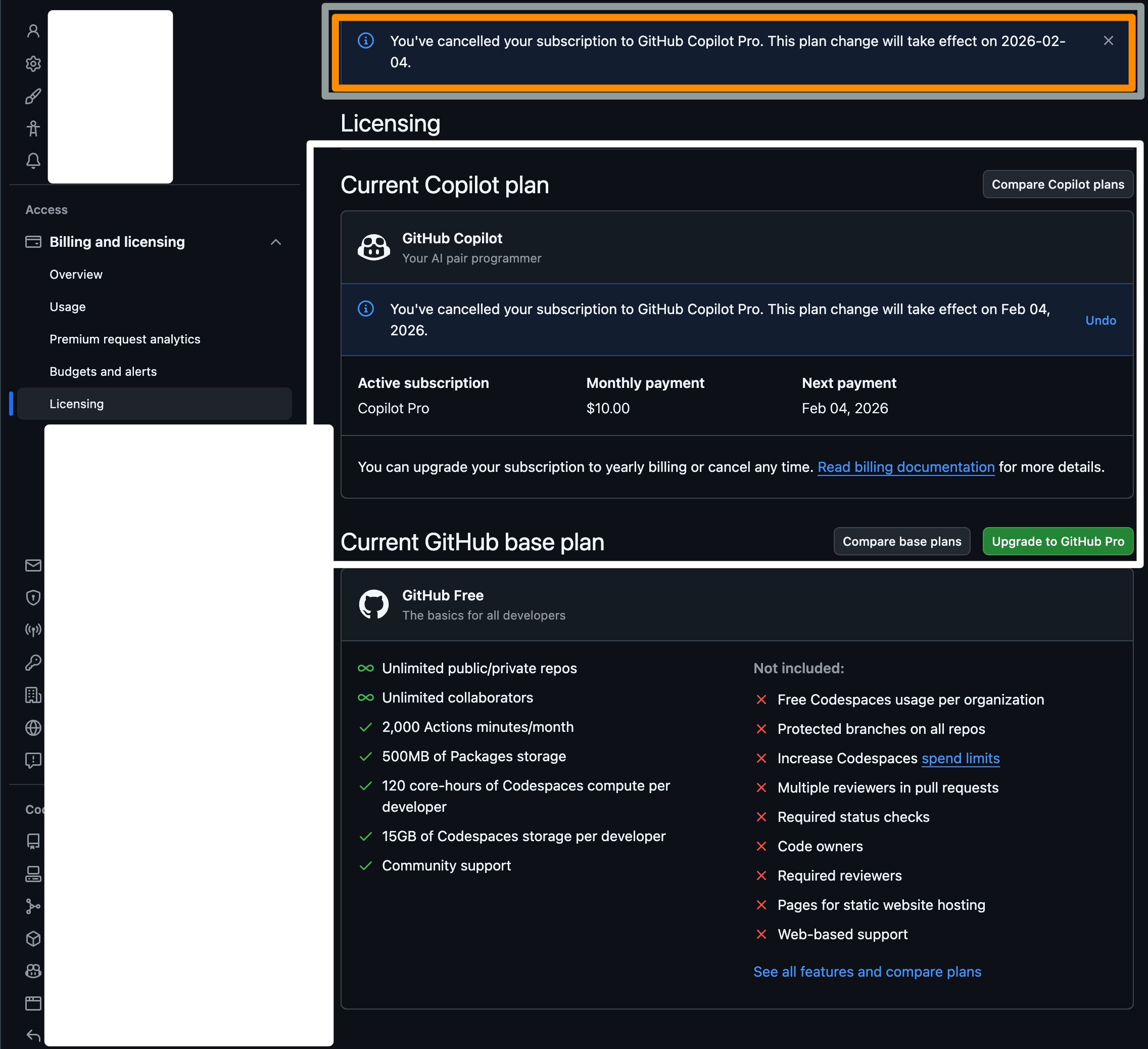 GitHub Copilot Pro サブスクリプションの解約